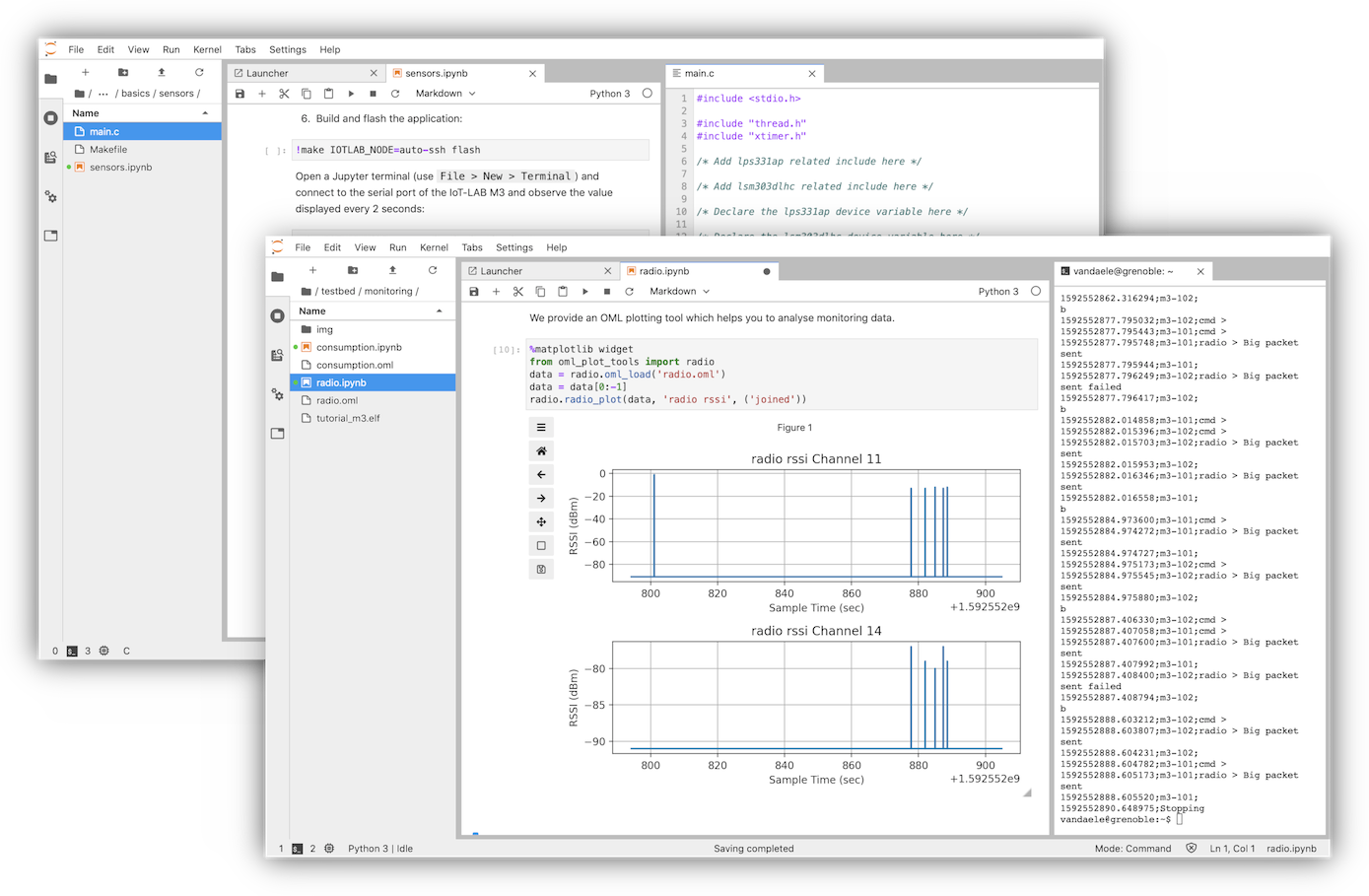 The JupyterLab server provides a full featured and zero-setup remote environment to learn how to program operating systems such as RIOT & Contiki-NG or how to use some of the testbed features.